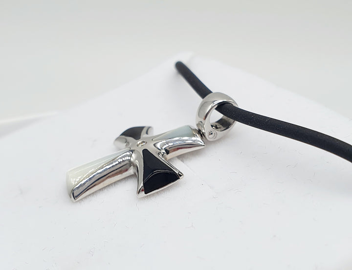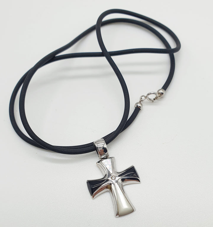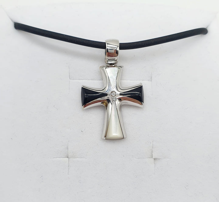 CIONDOLO CROCE ORO BIANCO 18K 750 ONICE E MADREPERLA + LACCIO IN CAUCCIU' CON CHIUSURA IN ORO BIANCO 18K 750 GR.3,62